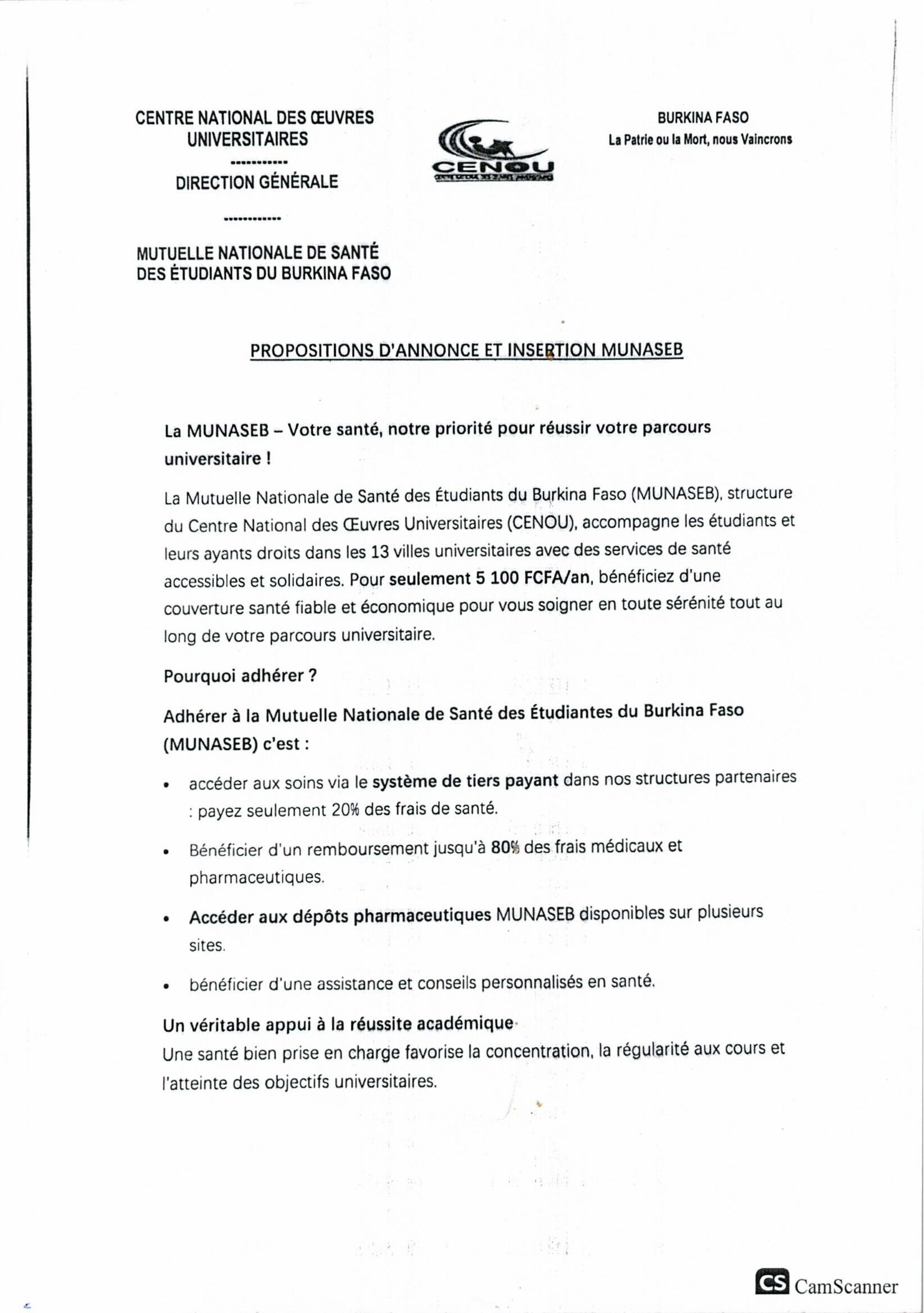 Mutuelle Nationale de Santé des Étudiants du Burkina Faso (MUNASEB) égale 80% de prise en charge sanitaire